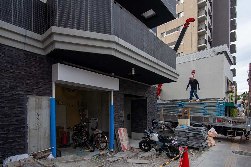 建物の外では、解体した足場鋼材をトラックに積み込んでいます。