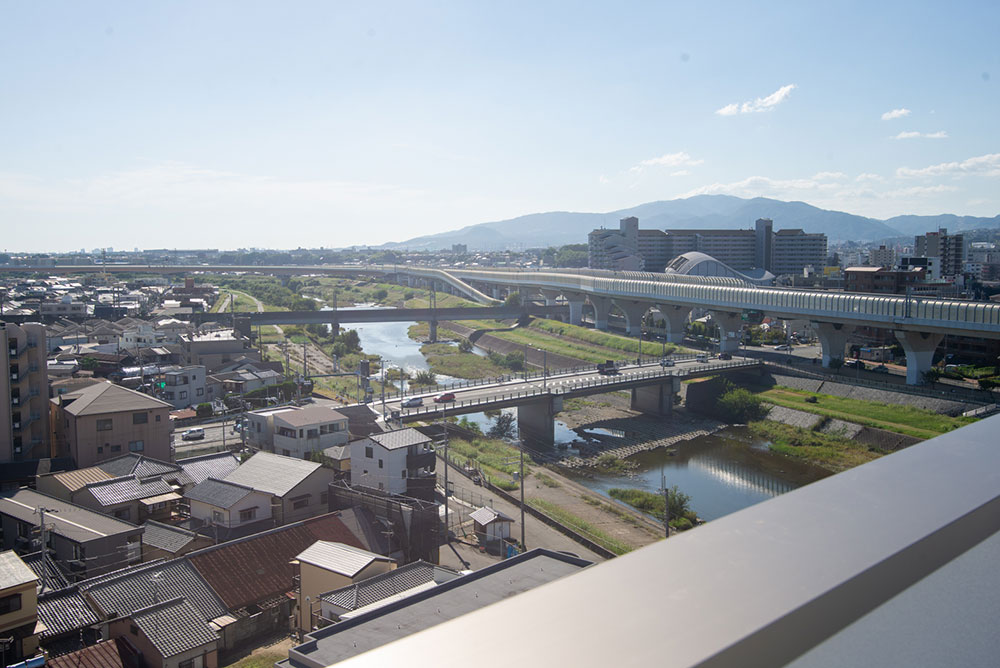 北西側を向くと、猪名川の上を跨る阪神高速道路の