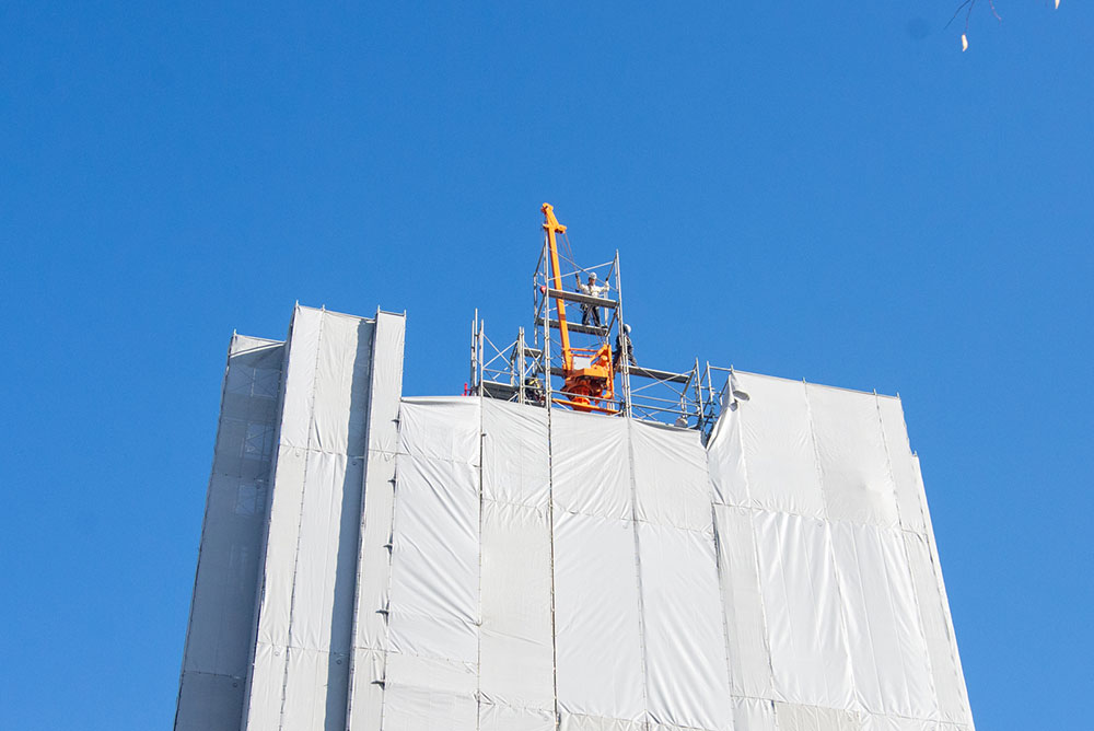建物の外では足場を上階に伸ばす作業をしています。作業員の方は慣れていらっしゃるのかと思いますが、高いところが得意ではない私は、見ているだけで足が竦みます。