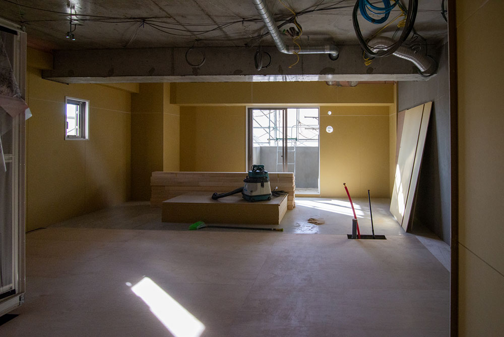 5階は造作工事の前段階です。外壁側の壁の石膏ボードが貼り終わったところです。
