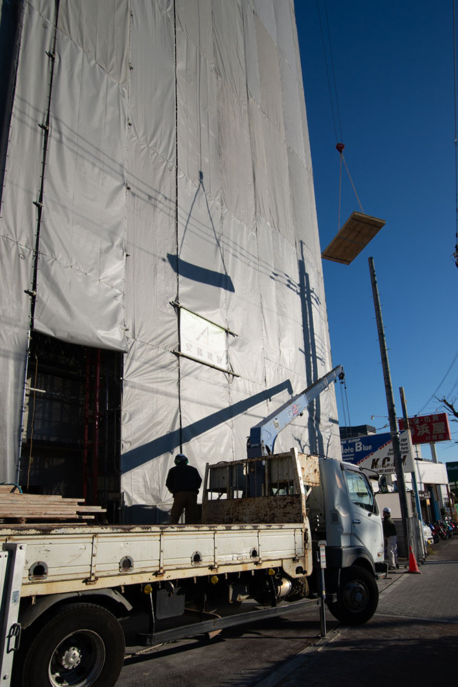 現場に到着すると、クレーンで型枠材料を最上階まで吊り上げていました。