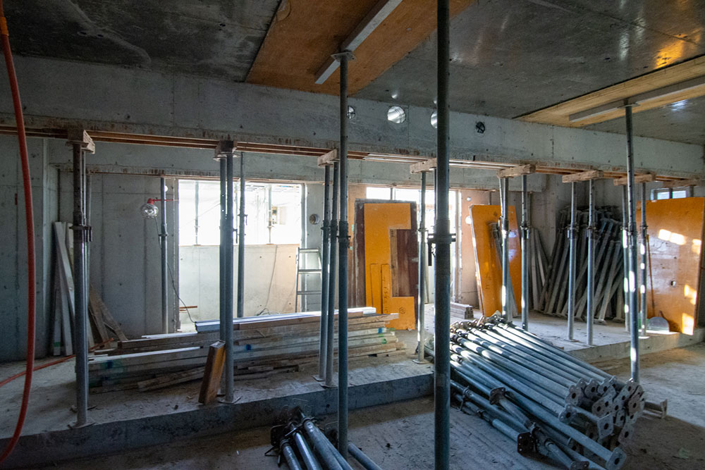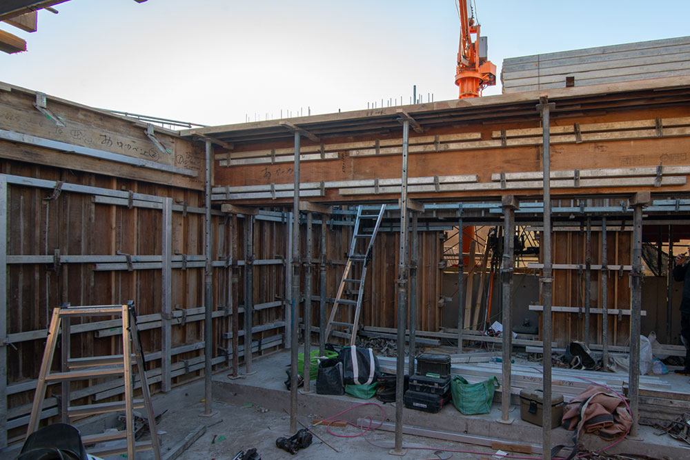 こちらは9階。コンクリートの強度が十分出るまでは、このように柱で抑えて養生されます。