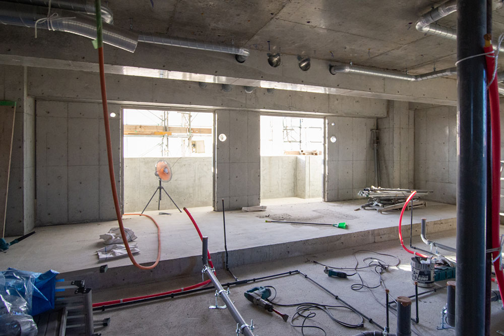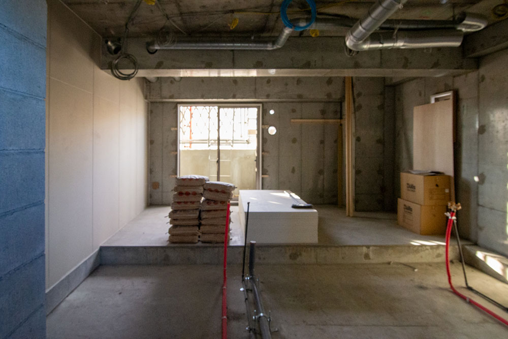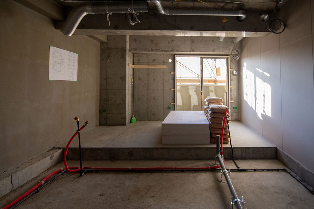 外壁側の石膏ボード貼りと、配管のところに床板が貼られました。