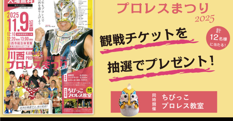 2025年11月9日に川西市総合体育館で開催される「川西プロレスまつり2025」ONLY ONE REAL ESTATEでは特別企画として「川西プロレスまつり2025」の観戦チケットを抽選でプレゼント! 【11/9 開催 … 続きを読む 川西プロレスまつり2025