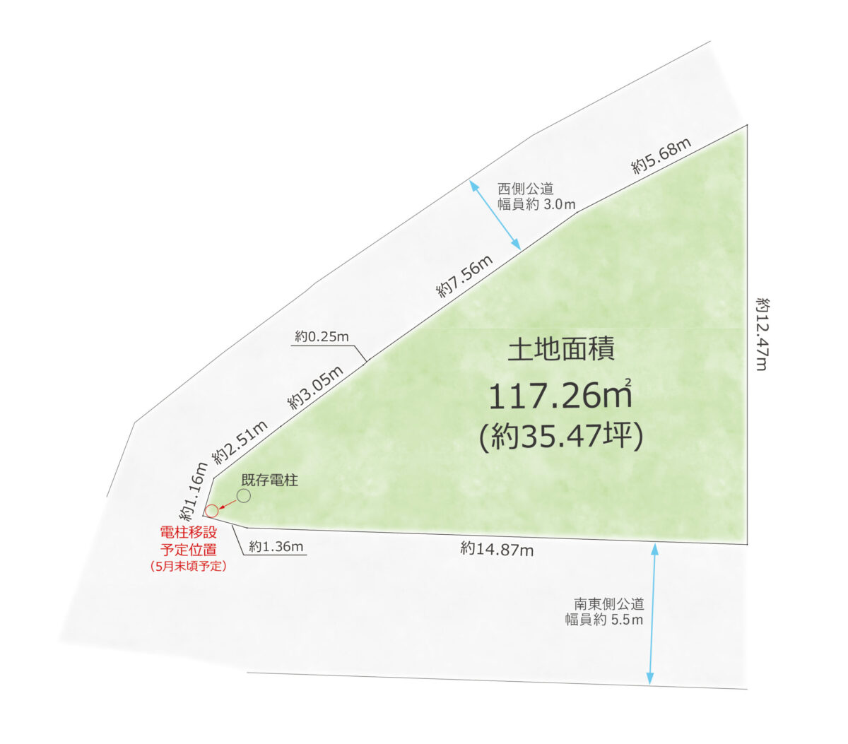 ※ 敷地内西側、一部電柱支線が空中越境しております。