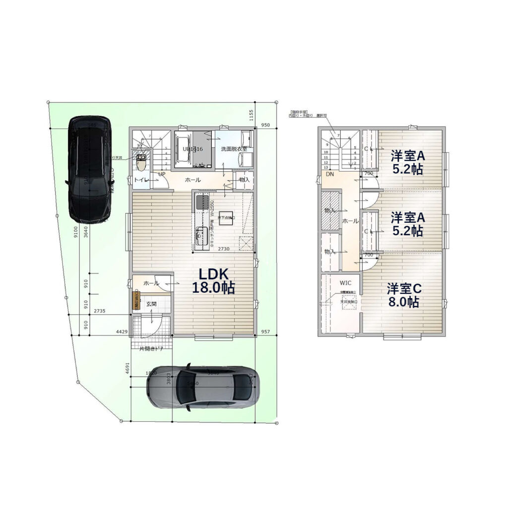 1階床面積:54.65㎡ / 2階床面積:45.54㎡